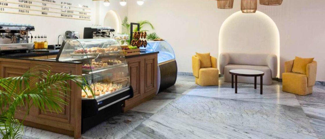 Coffee, gelato, pastries in a cozy setup.